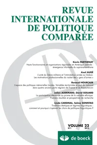 Varia Vol. 22, 2015/1 - pagesPages 7 to 31Senior Officials and Regional Organizations in Central America: The Informal Emergence of SupranationalismBy Kevin ParthenayPages 33 to 58Military Units and Armed Intimidation in Gabon: The Professional Motivations of Extortion by SoldiersBy Axel AugéPages 59 to 82Coping with the Past in Former French and British Slave Trade Ports. Local and National Variables in the Making of Memory PoliciesBy Renaud HourcadePages 83 to 114Electoral Participation and Ethnicity. First Results and Research AgendaBy Julien Audemard, David GouardPages 115 to 131State Traditions and Language Regimes: How and Why are Language Policy Choices Made?By Linda Cardinal, Selma SonntagPages 133 to 141Reviews
