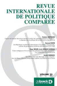 Varia Vol. 23, 2016/1 - pagesPages 7 to 33The Contribution of Latent Semantic Analysis to Multilevel Policy Analysis: The Case of Lifelong Learning PolicyBy Frédéric BertrandPages 35 to 56A World Republic of Administration? International Circulation, Governing Sciences, and Administrative Reform (1910-1945)By Renaud PayrePages 57 to 84Strategic and Economic Considerations in Arms Transfer PoliciesBy Lucie Béraud-Sudreau, Hugo MeijerPages 85 to 112Paris/Texas: The Indirect Promotion of “diversity” in U.S. and French Selective Institutions of Higher EducationBy Daniel SabbaghPages 113 to 130Reviews