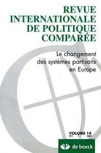 Le changement des systèmes partisans en Europe Vol. 14, 2007/2 - pagesPages 225 à 228IntroductionPages 229 à 241Les systèmes de partis en europe : équilibre, changement et instabilitéPar Nicolas SaugerPages 243 à 261Le changement des systèmes de partisPar Peter MairPages 263 à 280Comment analyser les changements dans les systèmes partisans d'Europe occidentale depuis 1945 ?Par Pierre MartinPages 281 à 302Application du modèle de Lipset et Rokkan à la BelgiquePar André-Paul FrognierPages 303 à 324Le changement des systèmes partisans et la transformation des espaces politiquesPar Michael Laver, Kenneth BenoitPages 325 à 339Le bipartisme imparfait en France et en EuropePar Gérard Grunberg, Florence HaegelPages 341 à 349Revue des revuesPages 351 à 355Le Centre Interdépartemental de Recherche sur le Changement Politique (CIRCaP) : une décennie d'effortsPar Christophe RouxPages 357 à 357Notices biographiques
