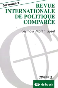 Seymour Martin Lipset Vol. 15, 2008/3 - pagesPages 315 à 321Introduction avez-vous lu Lipset ?Pages 323 à 333TémoignagesPar Juan J. Linz, Larry DiamondPages 335 à 362Du socialisme en Amérique. Seymour Martin Lipset et le mystère de l'impossible greffePar Michel HastingsPages 363 à 388La théorie des clivages. Où placer le curseur ? Pour quels résultats ?Par Pascale DelfossePages 389 à 409Lipset et les conditions de la démocratiePar Jean-Louis ThiébaultPages 411 à 443Populistes, extrémistes et ultras : une relecture de Political ManPar Daniel-Louis SeilerPages 445 à 461Une sociologie politique des campus. S.M. Lipset et la contestation étudiante des années 1960 aux États-UnisPar Cédric PassardPages 463 à 490AutobiographiePar Seymour Martin LipsetPages 491 à 517Bibliographie de Seymour Martin LipsetPages 519 à 519Notices biographiques