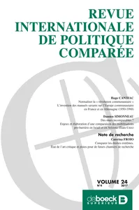 Varia Vol. 24, 2017/4 - pagesPages 321 à 348Normaliser la « révolution communautaire »Par Hugo CanihacPages 349 à 372Des murs incomparables ? Enjeux et élaboration d’une comparaison des mobilisations pro-barrière en Israël et en Arizona (États-Unis)Par Damien SimonneauPages 373 à 399Comparer les droites extrêmesPar Caterina FroioPages 401a à 403aAYMES M., GOURISSE B., MASSICARD É. (Eds.). (2013). L’art de l’État en Turquie. Arrangements de l’action publique de la fin de l’Empire ottoman à nos jours. Paris : KarthalaPar Jean-François PoloPages 401b à 408bAGUILERA, T. (2017). Gouverner les illégalismes urbains. Les politiques publiques face aux squats et aux bidonvilles dans les régions de Paris et de Madrid. Paris : DallozPar Gaja MaestriPages 401c à 411cLOZAC’H, V. (2016). Des doctrines aux réformes ? La modernisation de l’État en Allemagne. Rennes : PURPar Fabien JobardPages 401d à 415dBARANETS, É. (2017). Comment perdre une guerre. Une théorie du contournement démocratique. Paris : Éditions CNRSPar Simon DesplanquePages 401e à 420ePOULIOT, V. (2017). L’ordre hiérarchique international. Les luttes de rang dans la diplomatie multilatérale. Paris : Presses de Sciences PoPar Samuel B. H. Faure
